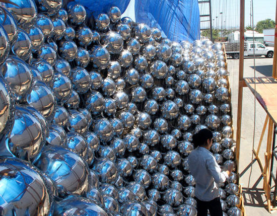 استودیوی دیزاین Ball Nogues در لس آنجلس به تازگی آخرین اثر هنری خود در زمینه طراحی برای فضاهای عمومی را به اتمام رساند. این پروژه، تندیسی فضایی است که در دیواره بیرونی ساختمان پارکینگی در سانتا مونیکا پالاس Santa Monica Palace - که اثر معمار مشهور فرانک گری است- اجرا شده است. رفت و آمد توریستها، هم به صورت پیاده و هم سوار بر خودرو، به این منطقه بسیار زیاد است. نام این اثر Cradle (آونگ) است و در 27 جولای 2010 نصب شد. ابعاد این آونگ بزرگ 12 متر در 11 متر است. این اثر بزرگ، توده ای از کره های استیلی براق است که مانند یک آونگ نیوتونی بزرگ عمل می کنند. هر گوی به وسیله یک کابل از نقطه ای روی دیوار آویزان است و به وسیله وزن خود و گوی های مجاور، در جای خود محکم شده است. صرف نظر از ایده بسیار جذاب و فرم بی نظیر این اثر هنری زیبا، روش و مراحل ساخت آن بخصوص در مورد ساخت گوی های بزرگ استیل، بسیار قابل توجه است. مؤسسین استودیو، آقایان Benjamin Ball و Gaston Nogues به وسیله این اثر، ادغام متدهای دیجیتال با واقعیت فیزیکی را نمایش داده اند.